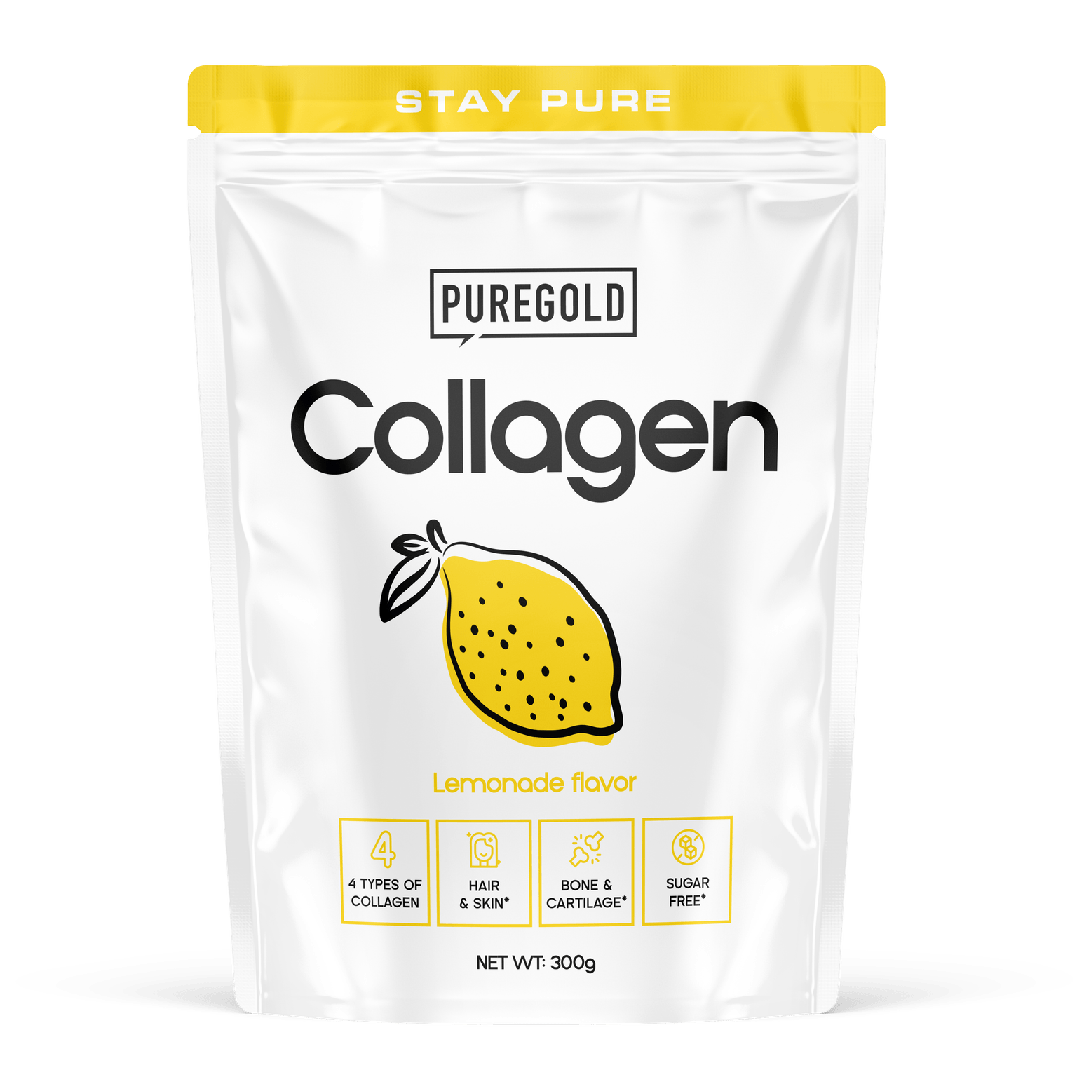 Collagen Marha kollagén italporPure Gold Collagen ízesített hidrolizált marha kollagén italpor hozzáadott vitaminokkal, cinkkel, szelénnel és édesítőszerekkel.