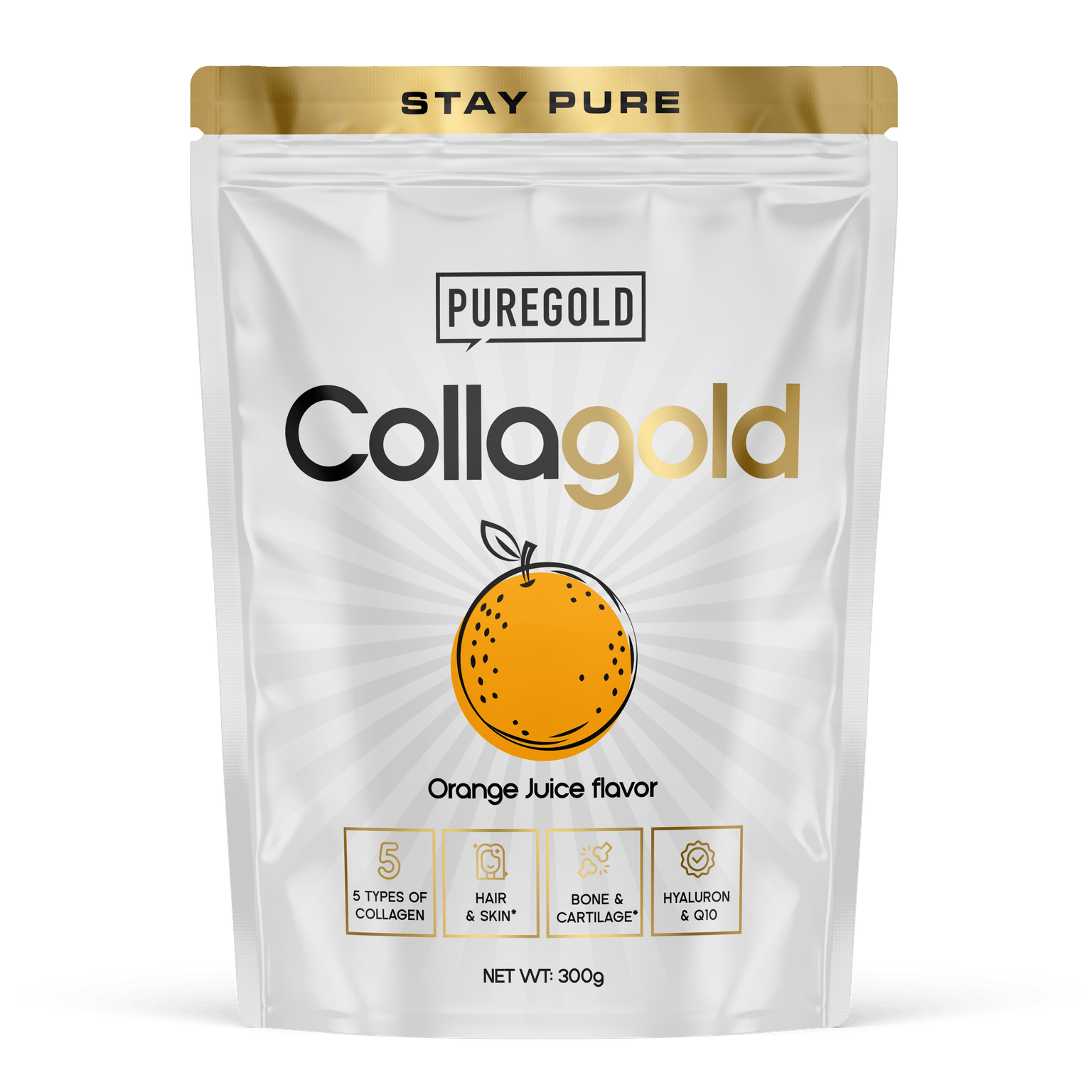 CollaGoldKomplex kollagén italporPure Gold CollaGold ízesített hidrolizált marha és tengeri halkollagén italpor hozzáadott hidrolizált csirkeporc porral, tojáshéjhártya-hidrolizátummal, vitaminokkal, cinkkel, szelénnel és édesítőszerekkel.