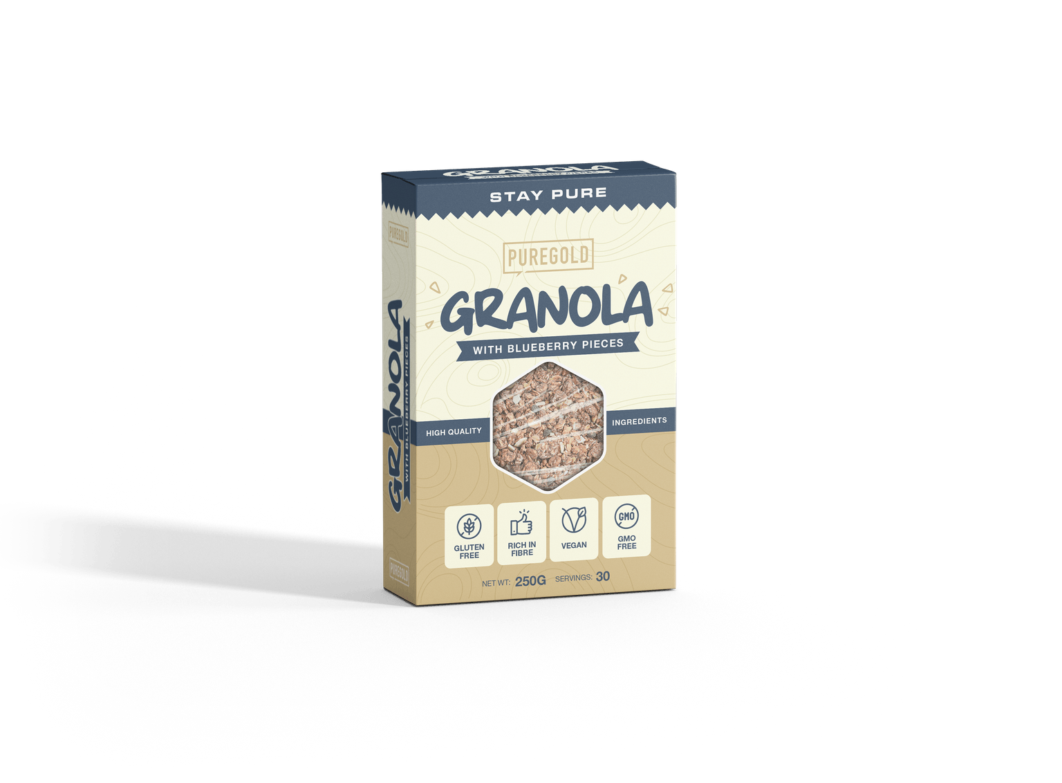 Összetevők: Gluténmentes zabpehely (62%), fruktóz, hántolt napraforgó mag, kandírozott vörösáfonya (6%), napraforgó olaj, kékáfonya sűrítmény (3,5%), szárított juharszirup, inulin, természetes aroma, só.